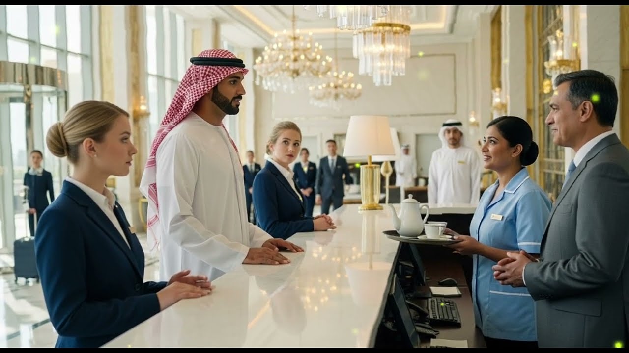 At a luxury hotel reception desk, staff were flustered when a simply dressed Arab man arrived speaking in a language they didn’t understand. Despite his calm demeanor, they assumed he wasn’t an important guest and struggling to communicate, growing impatient.