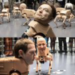 Robot dogs bearing the faces of Elon Musk and Mark Zuckerberg wreak havoc at a US exhibition.