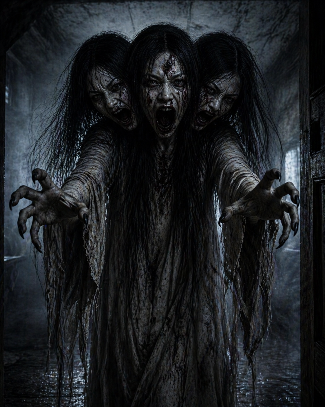 Survivors—if they could be called that—reported seeing a figure shrouded in darkness moving through the village. It had three heads, each more grotesque than the last. One head bore a twisted grin that stretched impossibly wide; another had hollow eyes that seemed to pierce into one’s very soul; the third head was featureless, an empty void that radiated despair. The creature moved with terrifying speed, its claw-like hands tearing through doors and walls as though they were paper.